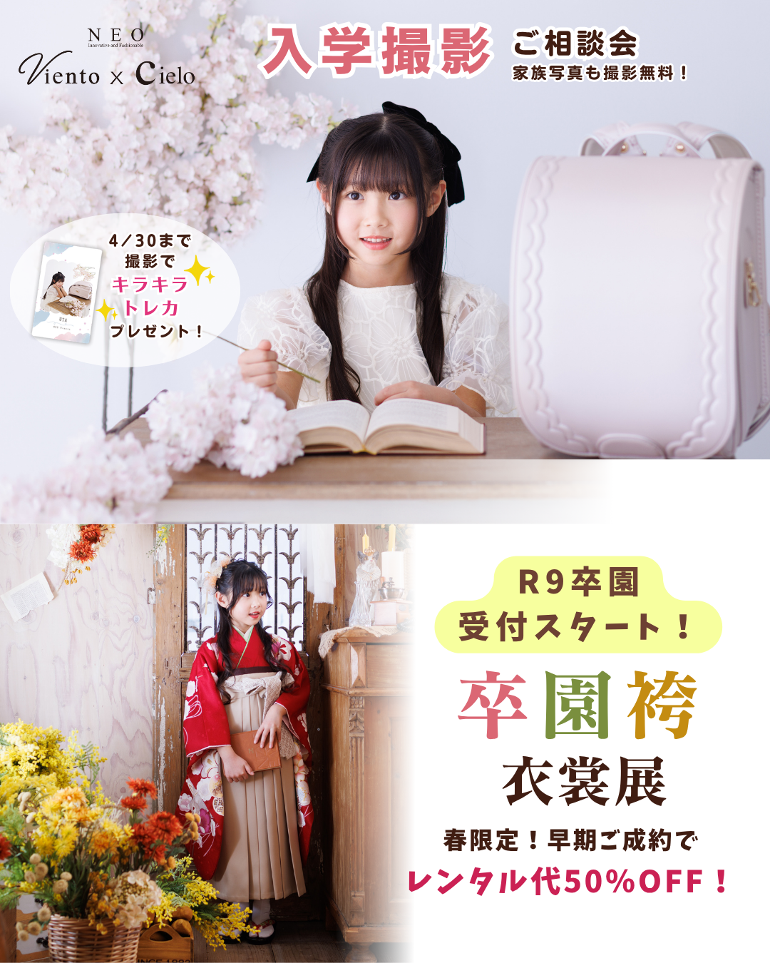 2026.03.30 VientoBaby & Kids & 七五三入園入学・卒園卒業 R9受付スタート!卒園袴衣裳展 令和9年度卒園袴がスタート! 当日レンタルの他、お写真撮影のみも大歓迎♪ 早期ご成約でお得にレンタル! 卒園袴レンタルは早く決めるほどお得! 早期ご成約で、通常料金から最大半額割引に! 卒園袴レンタル特典 卒園袴レンタルご成約で、袴前撮り撮影+ランドセル撮影分の基本料金も無料!カジュアルヘアセットも込みだからおすすめ♪ ランドセルがまだ届いてない場合も別日撮影可能です。 卒園袴撮影の詳細をCheck!